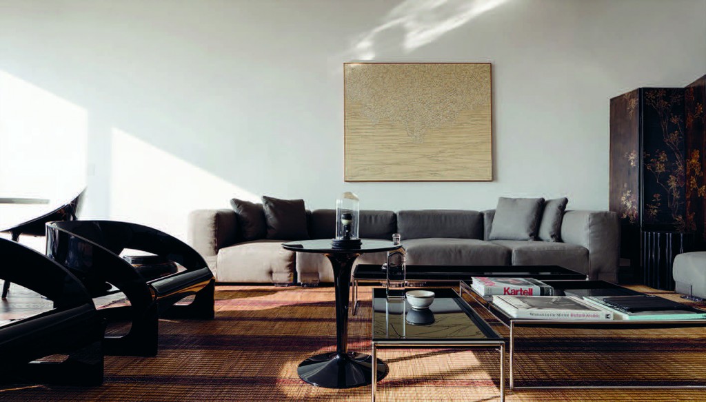 La série Trays est une collection de tables et d'étagères évoquant les laqués japonais: les plateaux sont réalisés dans un méthacrylate noir brillant très raffiné et la structure, en acier chromé, est travaillée avec légèreté.