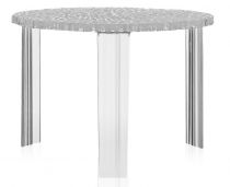 Ce concentré de technologie est moulé dans la matière pour obtenir cette surface si caractéristique de cette collection, composée d'une alternance de creux et de pleins comme une broderie. T-Table se décline en version transparente, colorée et noir opaque. Elle existe en 3 hauteurs différentes ( Basso: H 28 cm, Medio: H 36 et Alto: H 44 cm) et convient aussi bien pour une utilisation intérieure qu'extérieure.