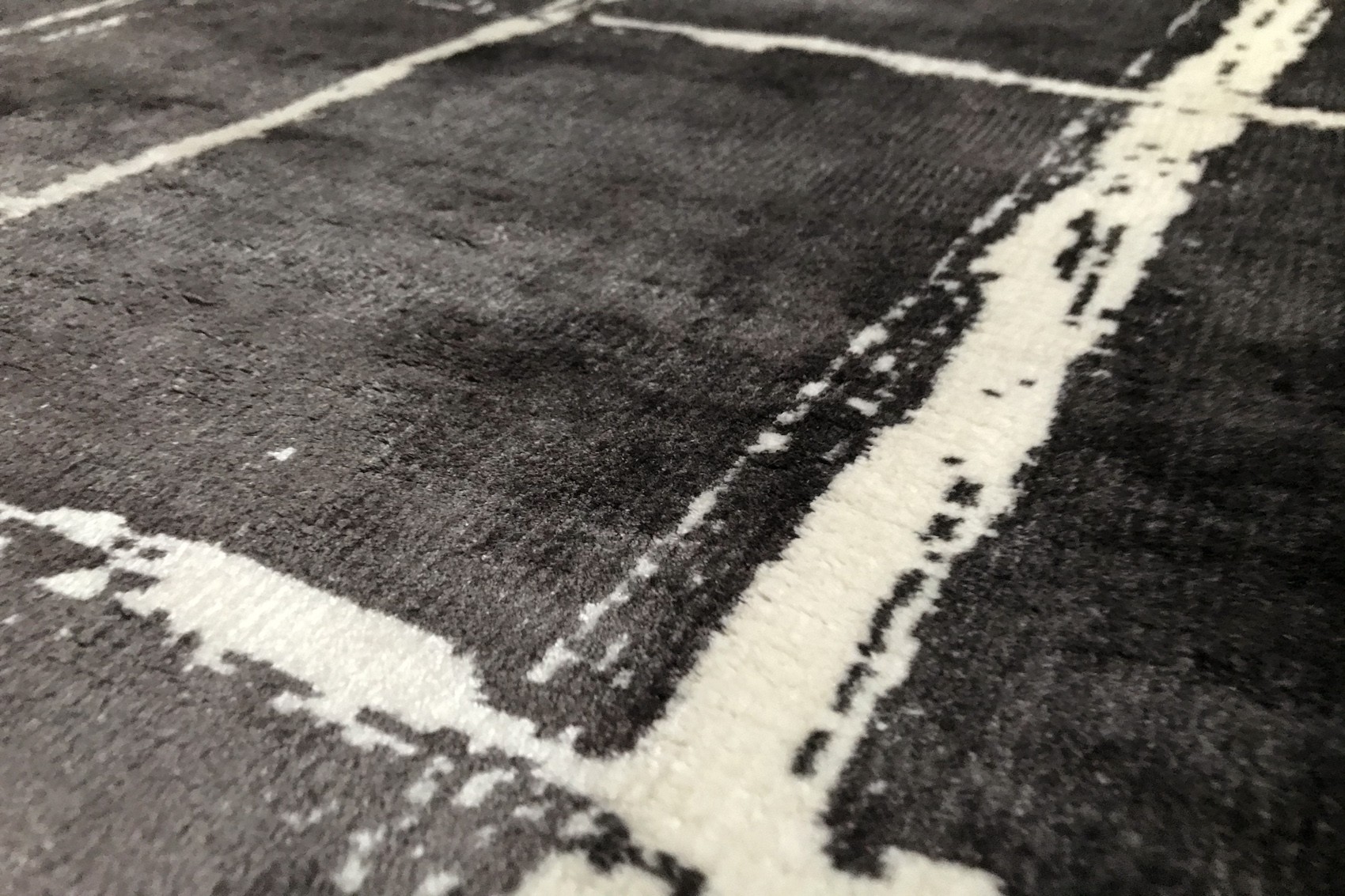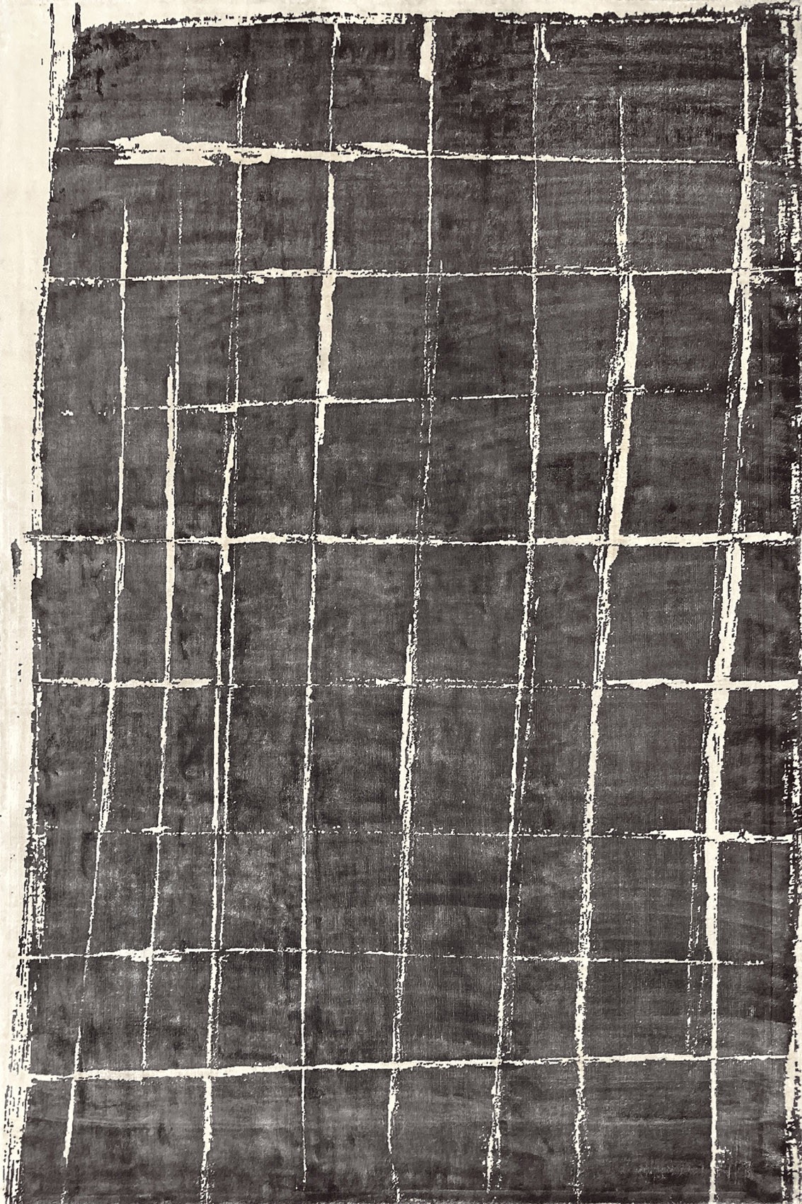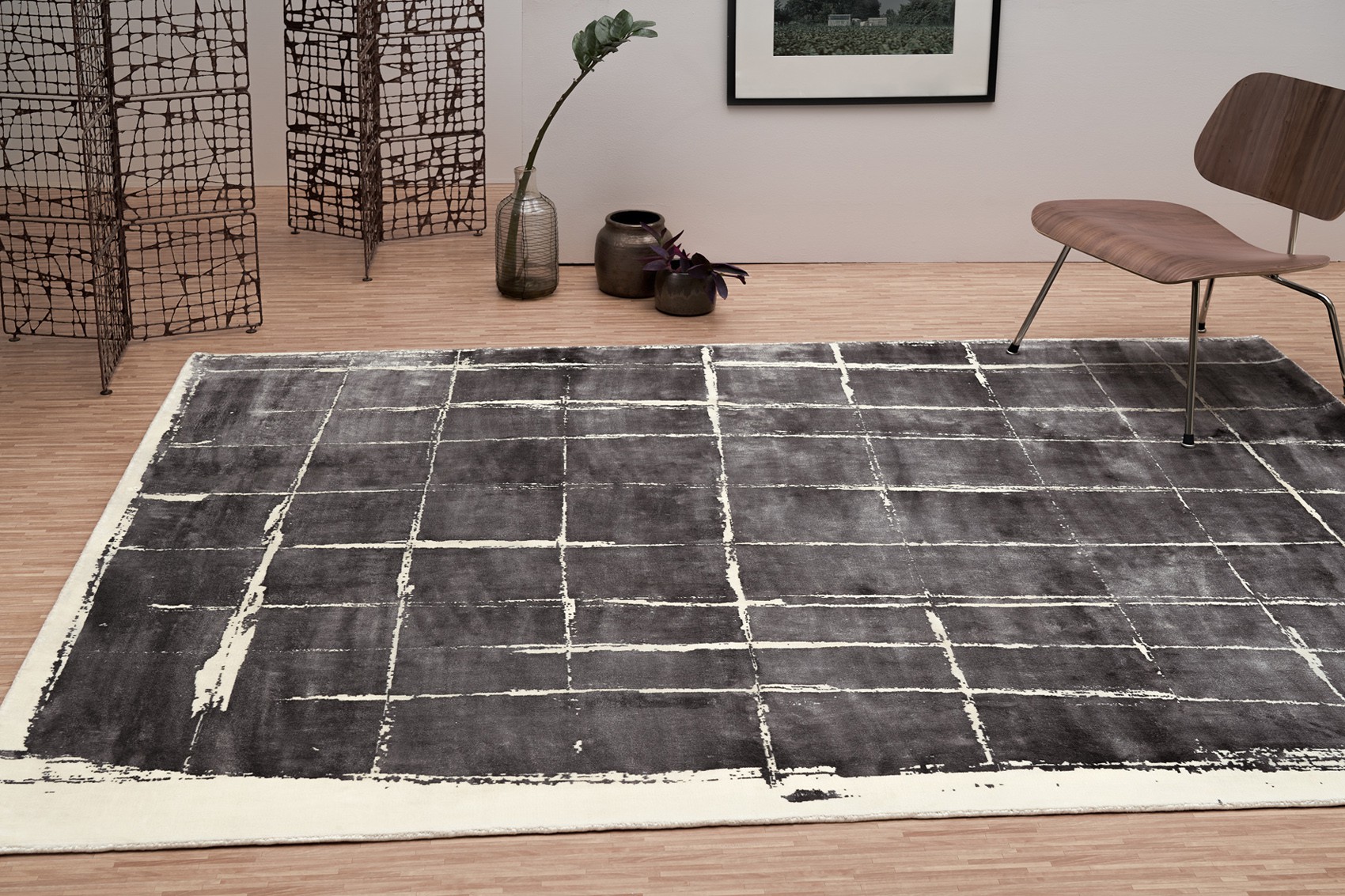 À travers des tonalités de gris, le tapis Herman laisse paraître un quadrillage au tracé irrégulier. Le chevauchement des traits qui traversent le tapis créé un dessin abstrait plein de volume et de relief renforcé par le contraste des couleurs.
