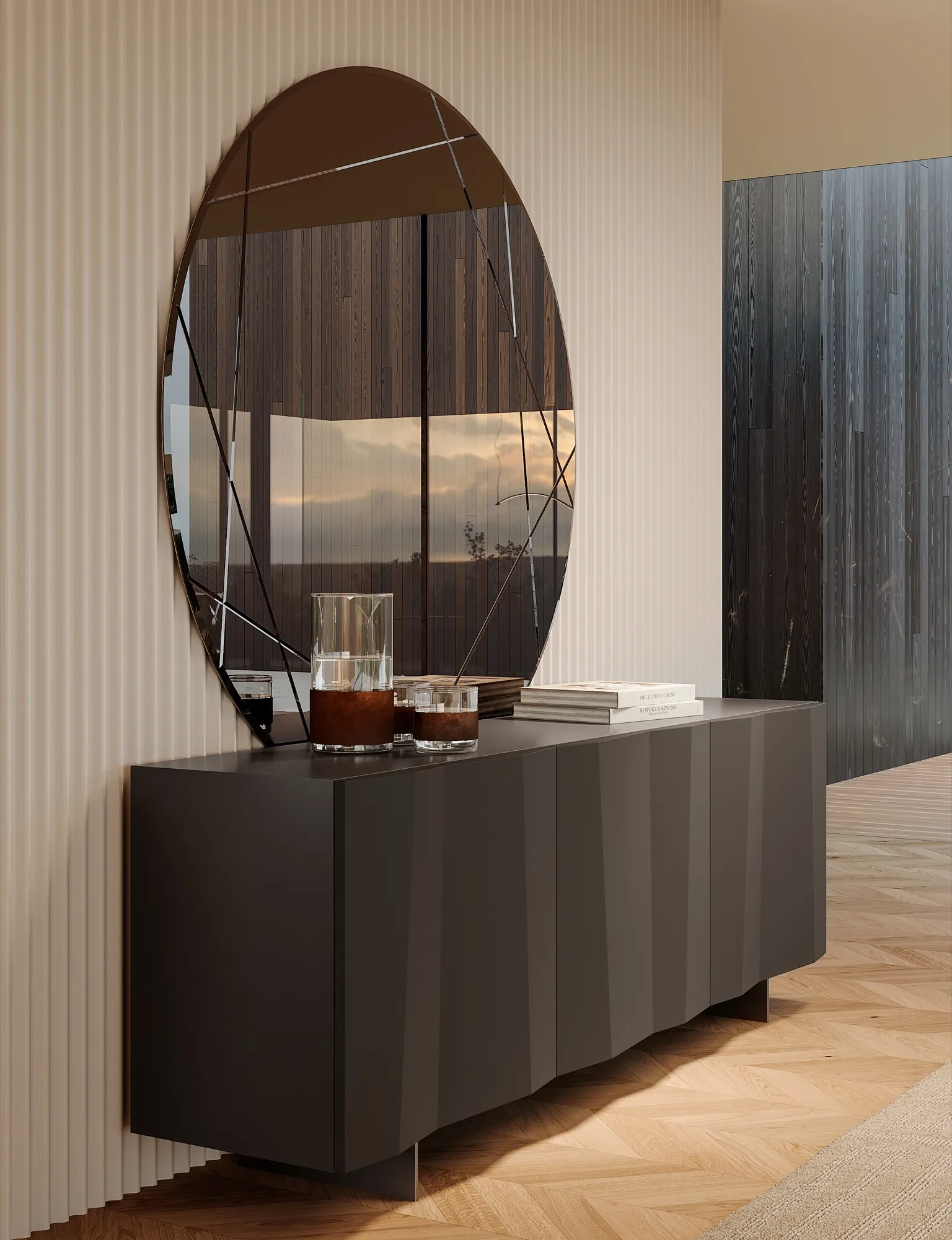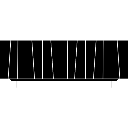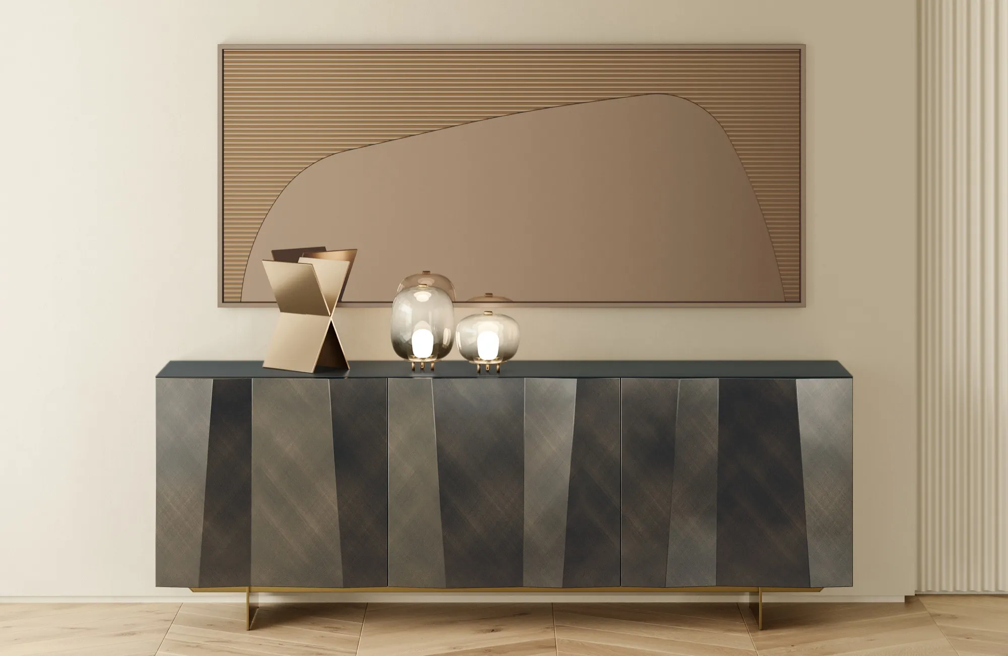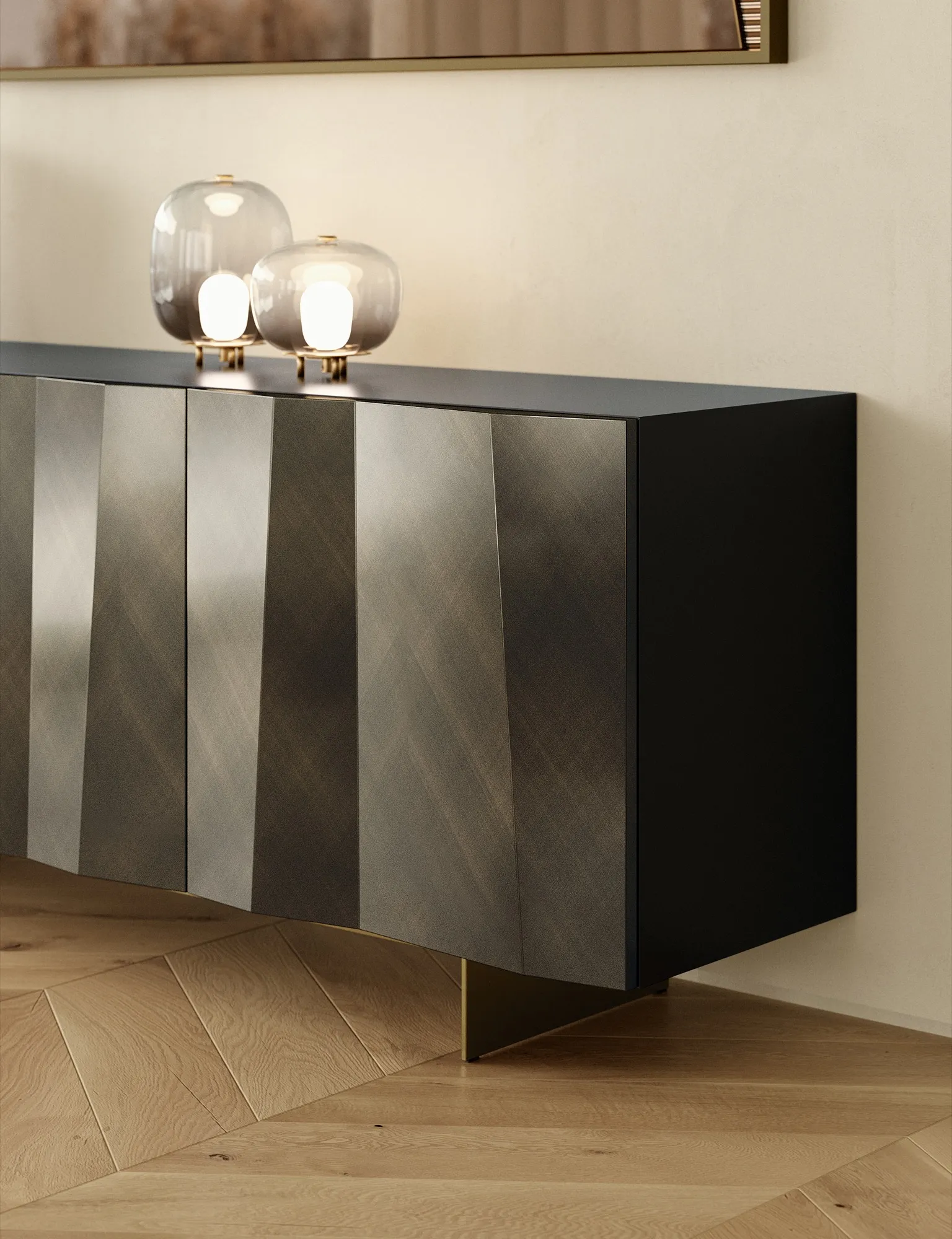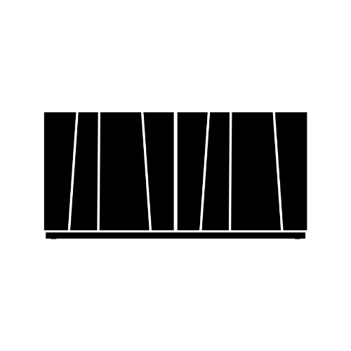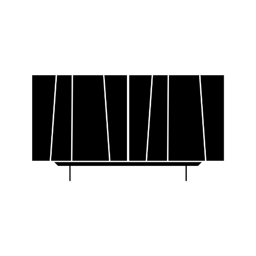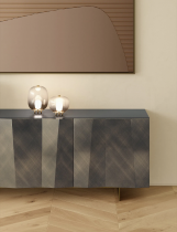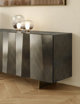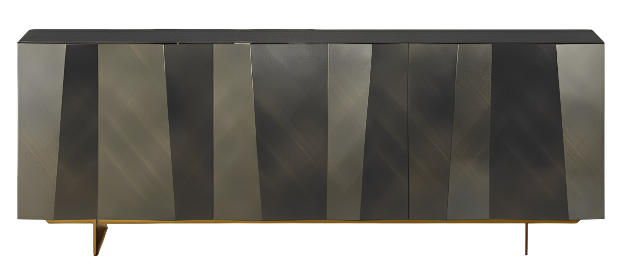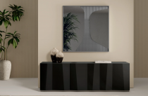 Les côtés et les portes du Bahut Kunta sont en bois laqué, disponibles en deux finitions distinctes : un noir profond ou un anthracite avec un effet brossé. Ces options permettent de s’adapter à différents styles de décoration intérieure, tout en ajoutant une touche de raffinement. L'effet ondulé et asymétrique sur les portes est particulièrement remarquable, créant une perspective et une dynamique de relief qui font de ce meuble un véritable objet d'art.