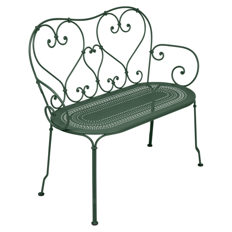 Le charme d'Antan sous le parfum des roses, le chant des oiseaux, une invitation poétique à la détente ... la banquette 1900  arbore un style rétro romantique donnant à votre jardin un charme inégalable dans la plus pure tradition: des volutes et bagues forgés à la main, une assise en tôle acier perforée et des coloris anti-UV.