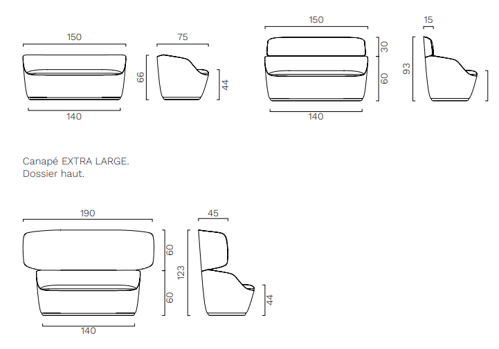 • Dimensions L.150 x Ht.66 x P.75 cm | L.150 x Ht.90 x P.75 cm | L.190 x Ht.123 x P.75 cm