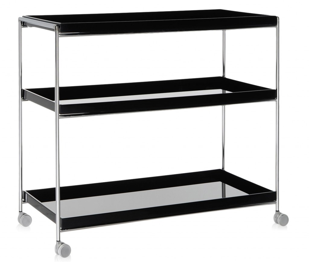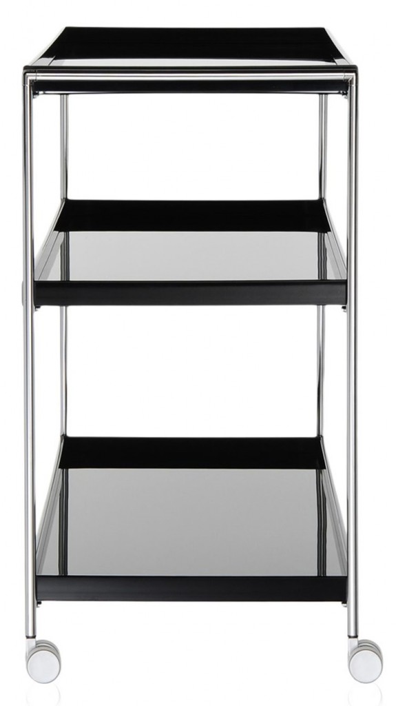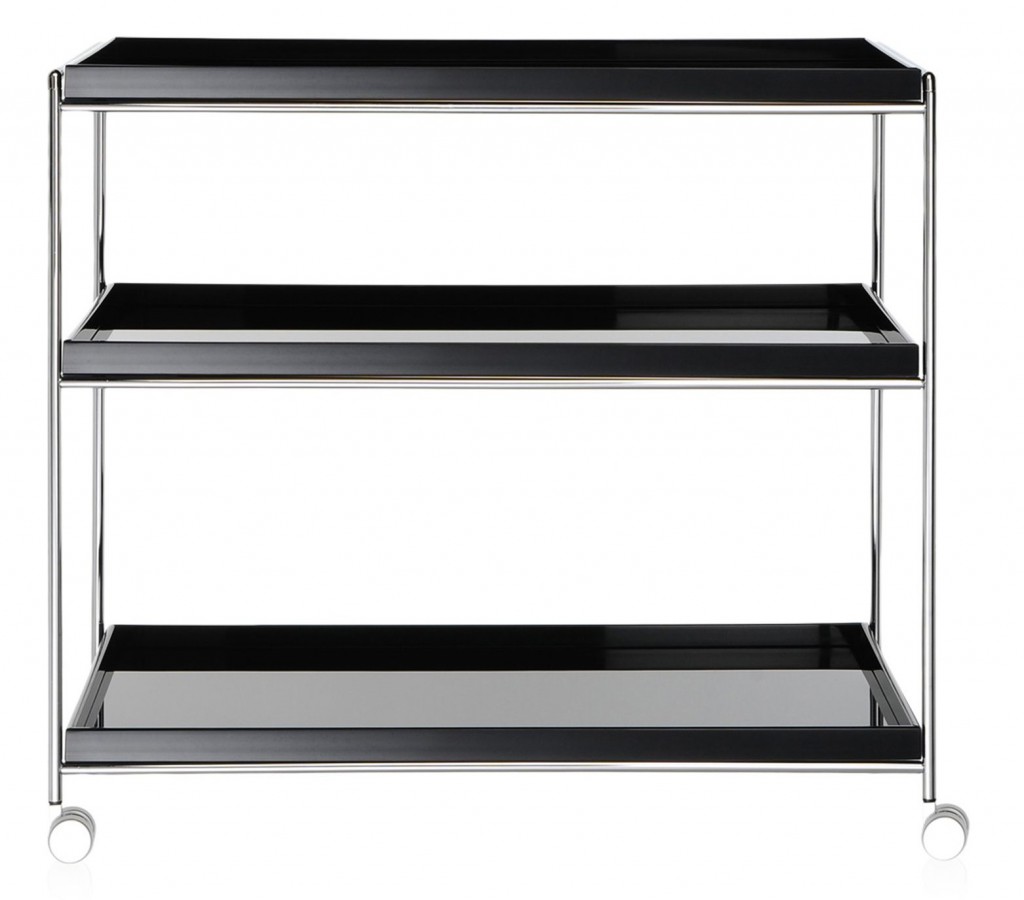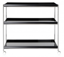 La série Trays est une collection de tables et d'étagères évoquant les laqués japonais: les plateaux sont réalisés dans un méthacrylate noir brillant très raffiné et la structure, en acier chromé, est travaillée avec légèreté.