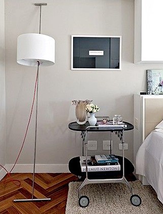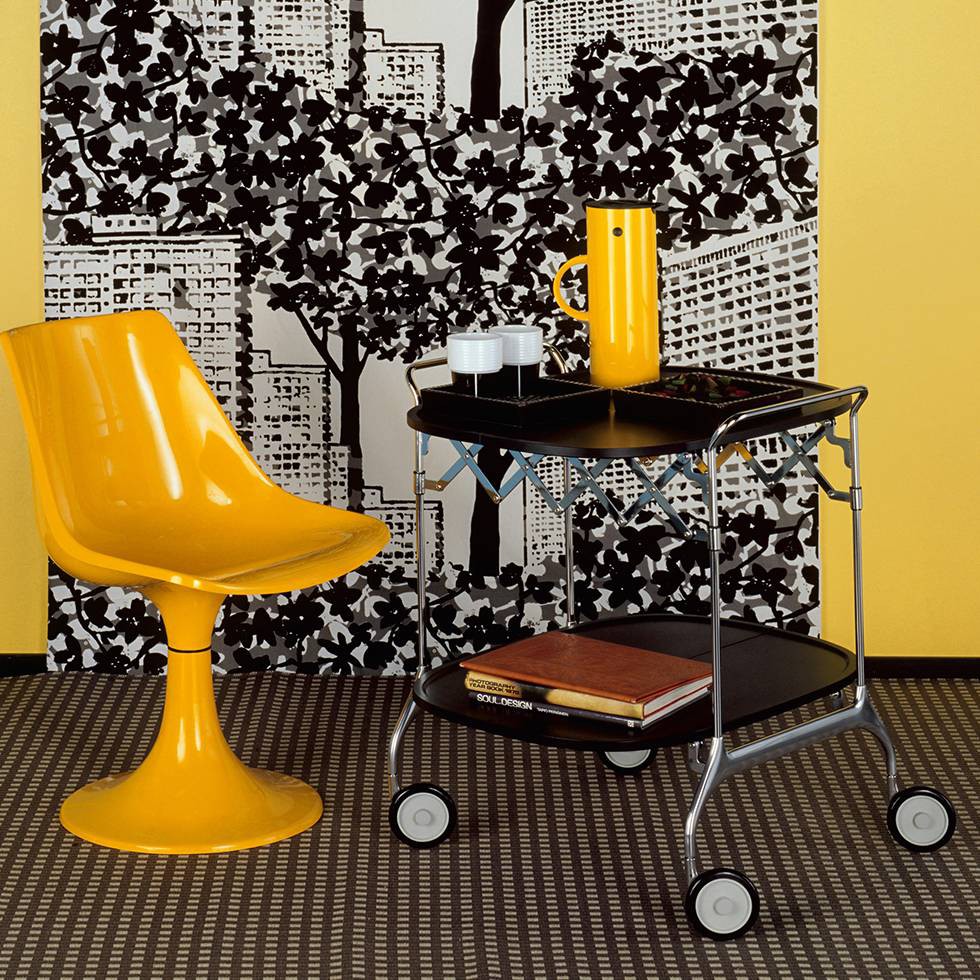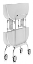Elégante desserte sur roulettes qui conjugue avec réussite un plateau coloré en ABS et une structure en acier chromé.