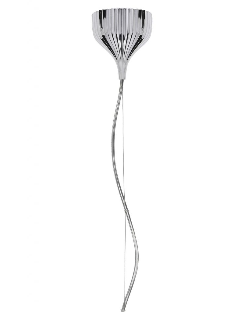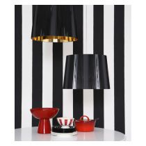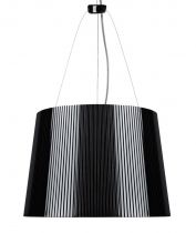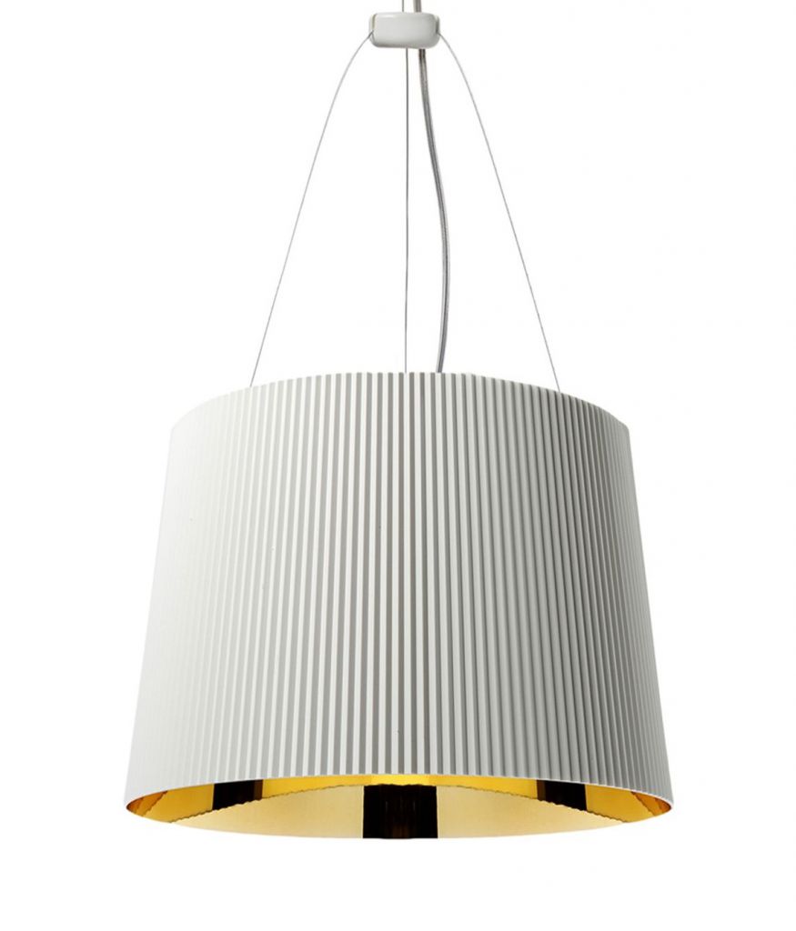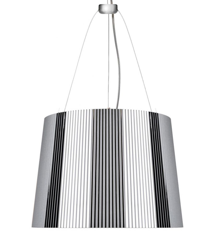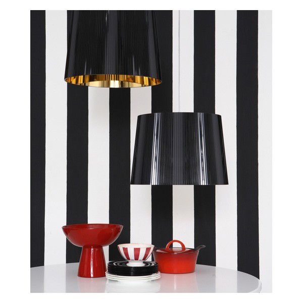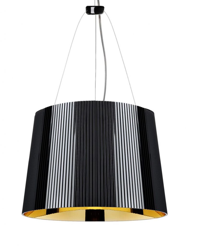 La suspension Ge est une création de Ferruccio Laviani pour kartell, offrant un jeu de lumière incomparable et exceptionnel: composée d'un grand abat-jour à l'effet plissé, en polycarbonate chromé, elle brille de mille reflets. Elle se fixe au plafond à l'aide d'une rosace décorée qui n'est pas sans rappeller celle des lustres anciens en verre de Murano. Elle se décline en trois coloris: noir ou blanc à l'extérieur de l'abat-jour et or à l'intérieur ou chrome intérieur et extérieur.