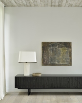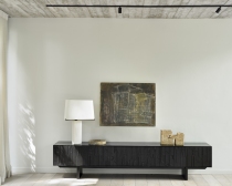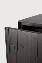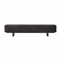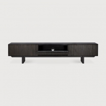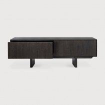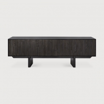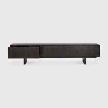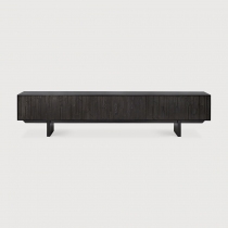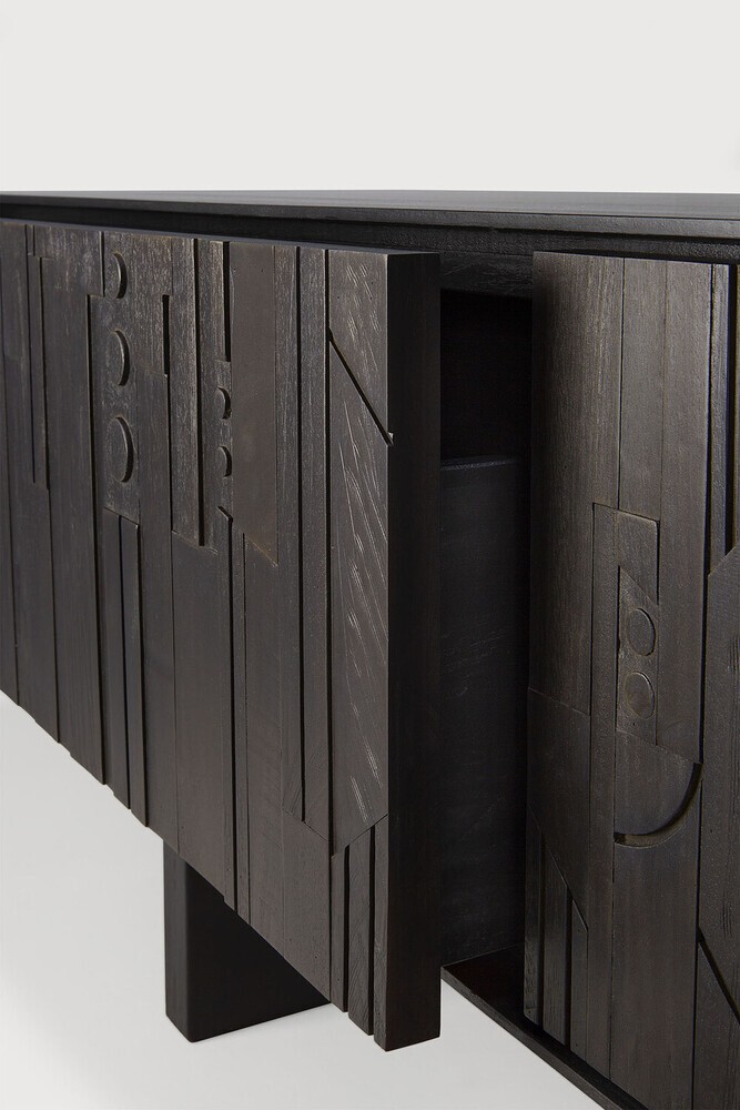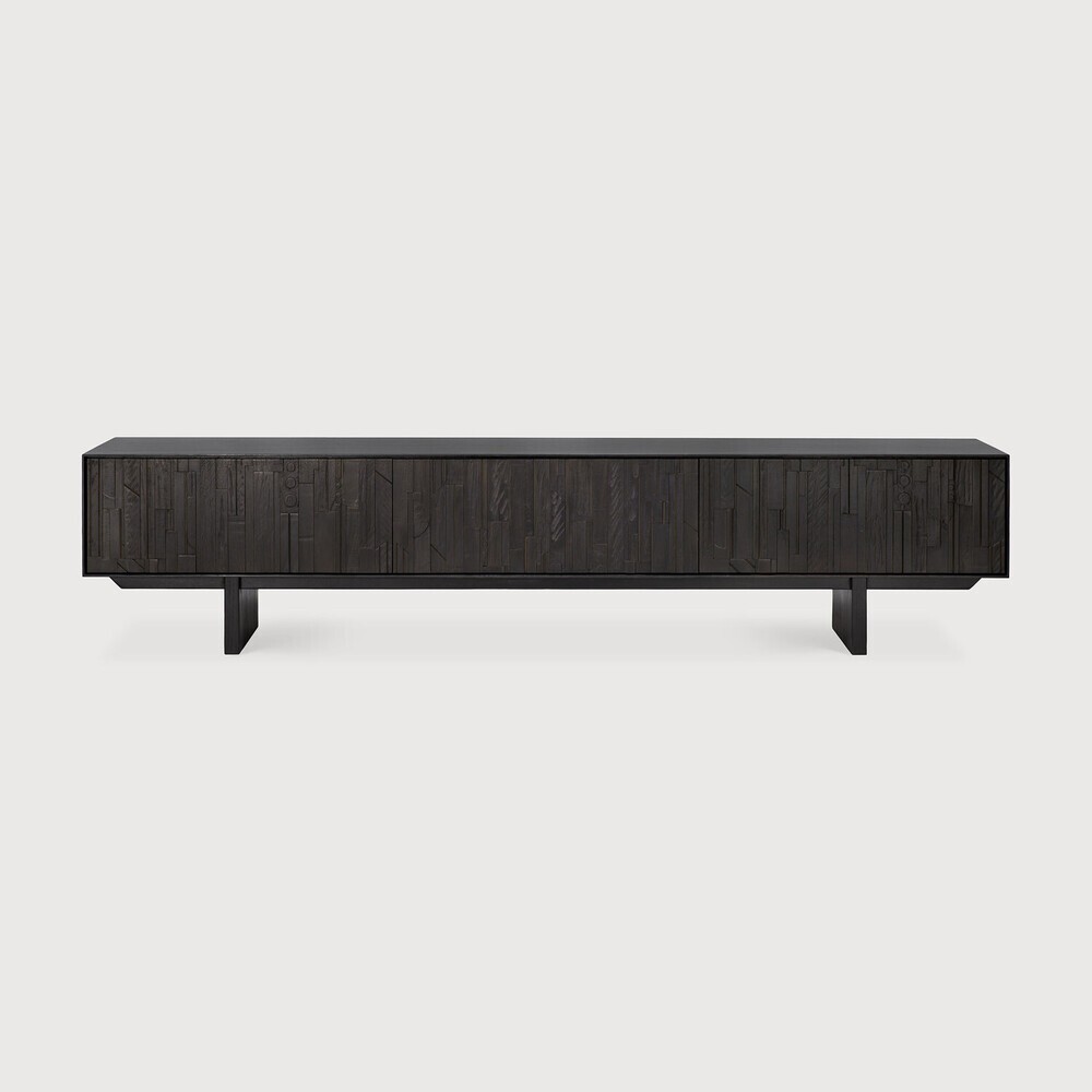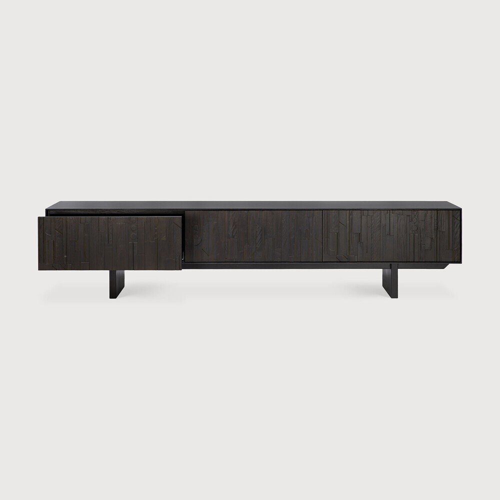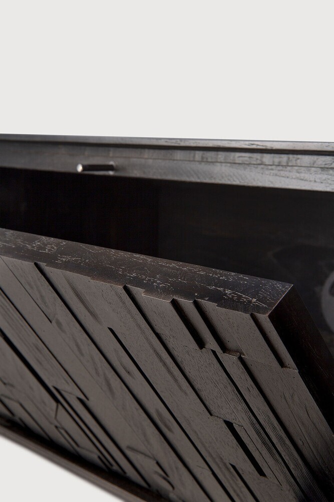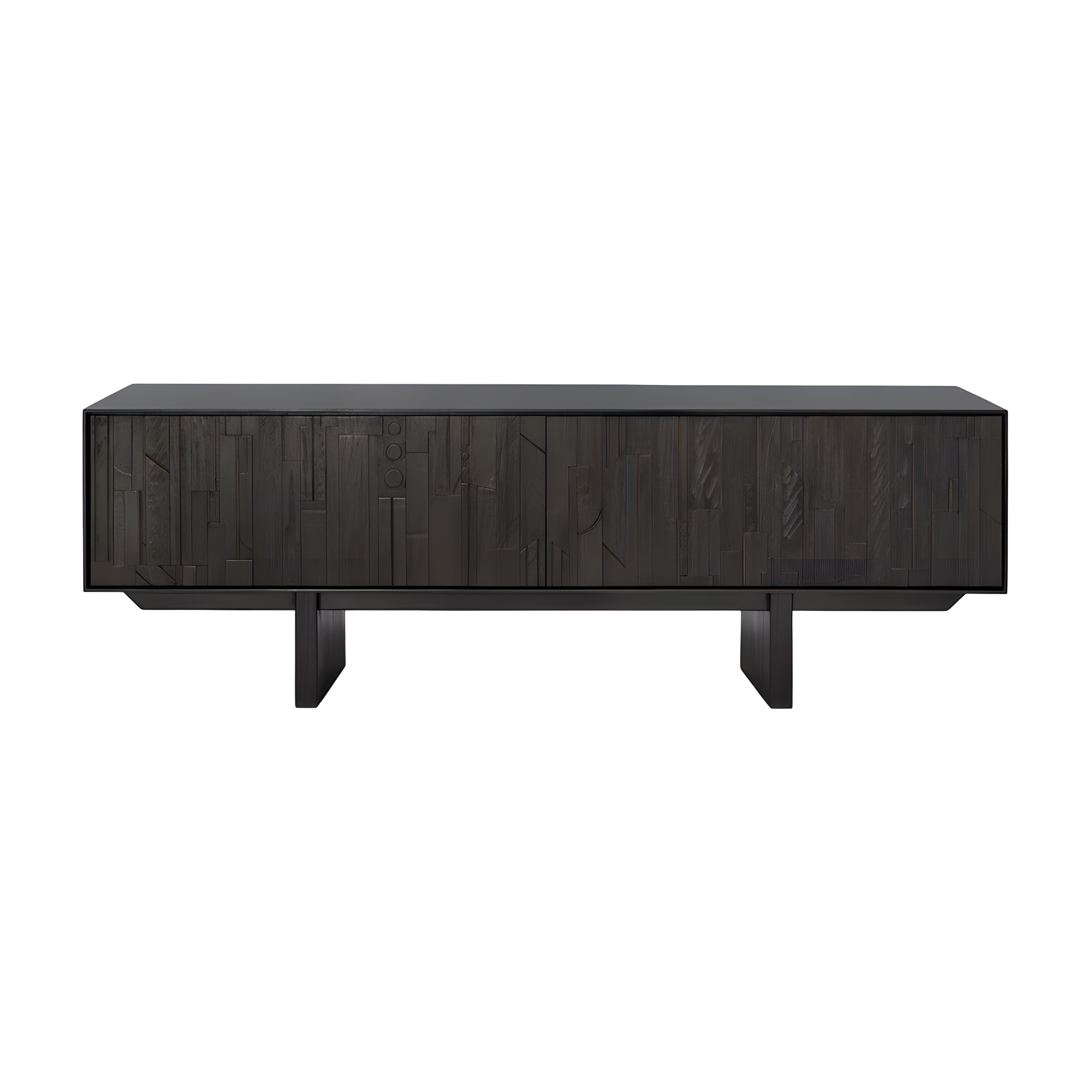 Chaque détail du meuble TV Mosaic a été pensé pour offrir une expérience à la fois visuelle et tactile. Le teck massif, teinté en noir et doté d'une finition vernie, met en valeur le grain naturel du bois, tandis que les éléments de construction proviennent de chutes soigneusement sélectionnées, issues du processus de fabrication. Cette approche écoresponsable s’inscrit pleinement dans la philosophie d'Ethnicraft, qui valorise le respect de l’environnement et la durabilité de ses matériaux.