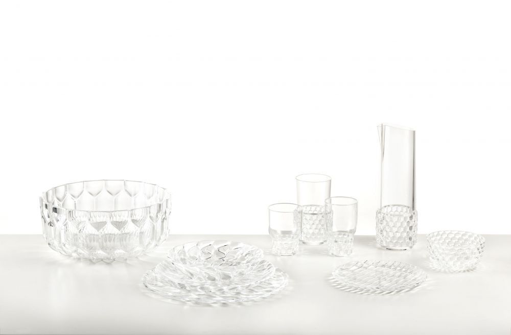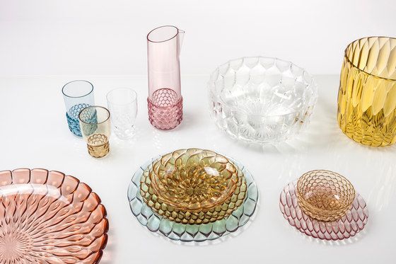 Réf. : KA1494B4 Une riche gamme d'assiettes, de plateaux, de verres, de bols et de carafes réalisée dans un PPMA brillant, coloré et transparent. La particularité de cette collection vient du fait que chaque modèle présente un motif différent s'inspirant clairement de la nature et de l'organique et rappelant les moules qui servaient autrefois à faire les gélatines. Elle met ainsi en évidence la temporalité et donc aussi la variété caractérisant chacun des passages de l'entrée au dessert. Ses couleurs transparentes, discrètes et délicates, qui peuvent facilement être assorties, permettent de préparer la table de manière variée : créative et originale ou plus classique et monochrome. Les superpositions des assiettes et les assortiments de couleurs créent un ensemble extroverti mais discret, à la fois créatif et sophistiqué.