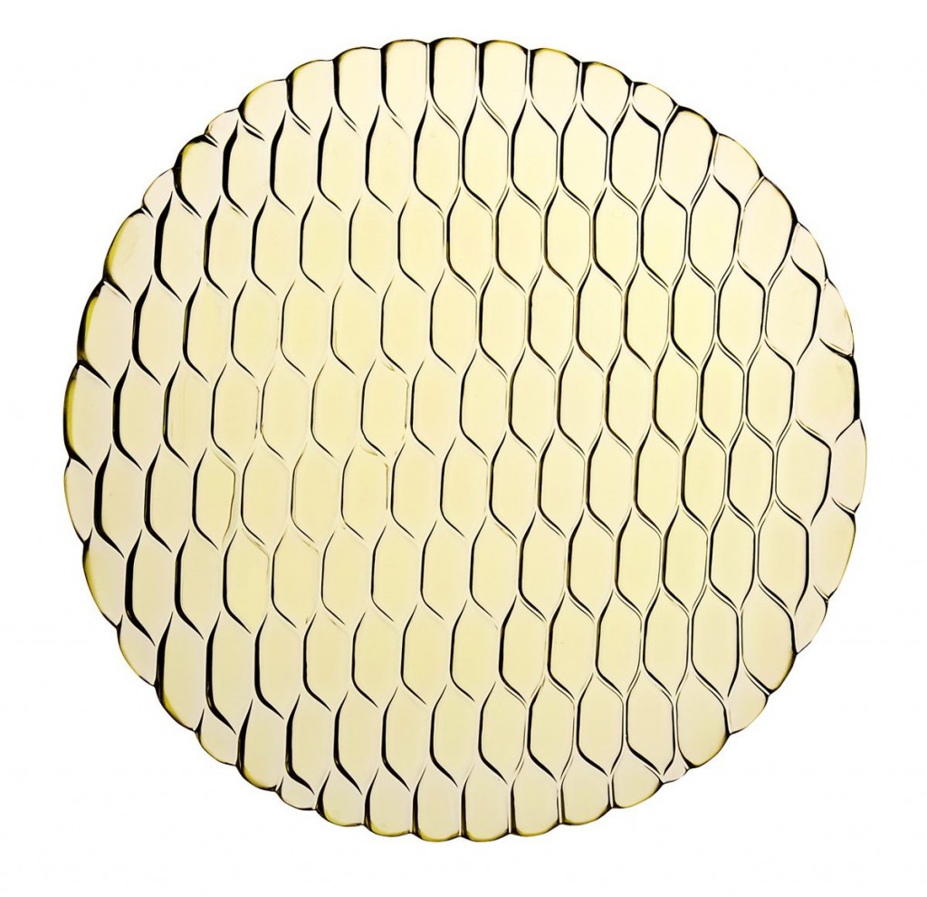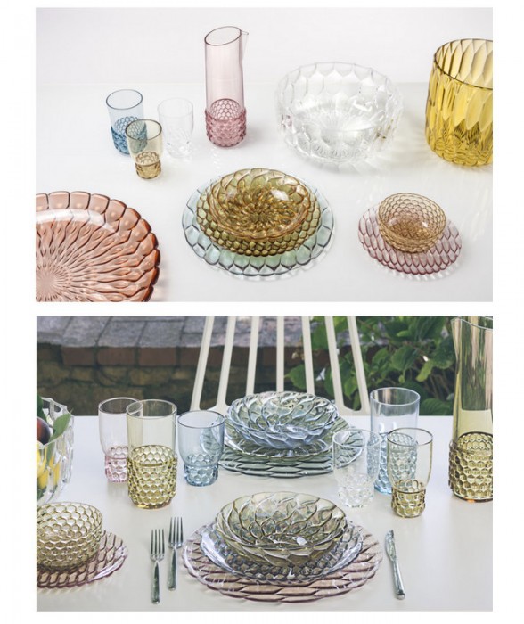 La célèbre créatrice Patricia Urquiola signe « Jellies Family », une collection de carafes, verres, assiettes et plats colorés et originaux... Les lignes nettes de cette collection contrastent avec la surface ornée de motifs en relief. Cette surface irrégulière et organique évoque les alvéoles d’une ruche d’abeilles. Une ornementation féminine et vintage qui apporte un twist ultra chic à cette pièce minimaliste.