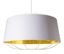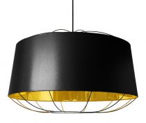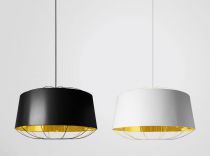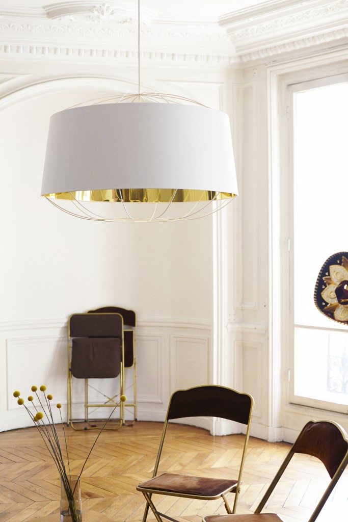 Le designer Sam Baron nous livre une interprétation luxueuse de la traditionnelle lanterne en papier chinoise. L'élégant abat-jour revêtu de coton est habillé d'une structure "cage" en acier. Aérienne et ultra graphique, cette structure ajourée apporte une dimension contemporaine à cette suspension. Très chic, la finition or à l'intérieur de l'abat-jour reflète la lumière, fournissant un éclairage à la fois puissant et chaleureux.