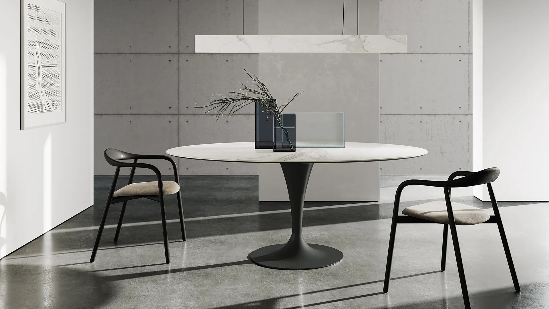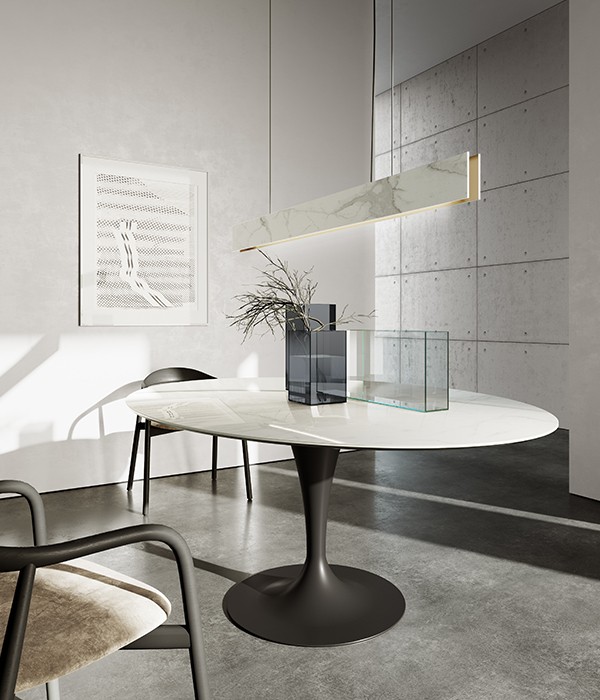 • Caractéristiques Existe en rond, ellipse ou carré arrondi. Plusieurs coloris de piètement (aluminium gaufré blanc, café, argile, noir ou chrome). Plusieurs finitions de plateau (céramique, verre laqué, verre dépoli, verre transparent et marbre).